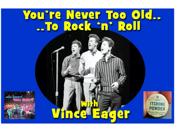 Join Vince for his slide and talk presentations as he recalls the heady days when, as a major pop star in the late 1950s & 60s he appeared on prime time television most Saturday evenings on such shows as the "Six Five Special", "Drumbeat" and "Oh Boy". Vince's takes you behind the scenes whilst touring with pals such as Joe Brown, Billy Fury, Marty Wilde, Adam Faith, Cliff Richard, Eddie Cochran Gene Vincent and many more. He reveals the mischief and mayhem they created, including an altercation with TV's smallest big star! It's fascinating and not to be missed!